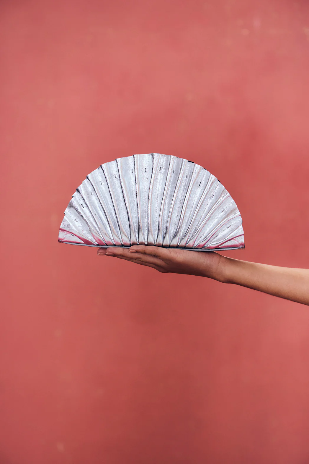 A shell-shaped clutch crafted in eye-catching silver with an invisible magnetic closure.