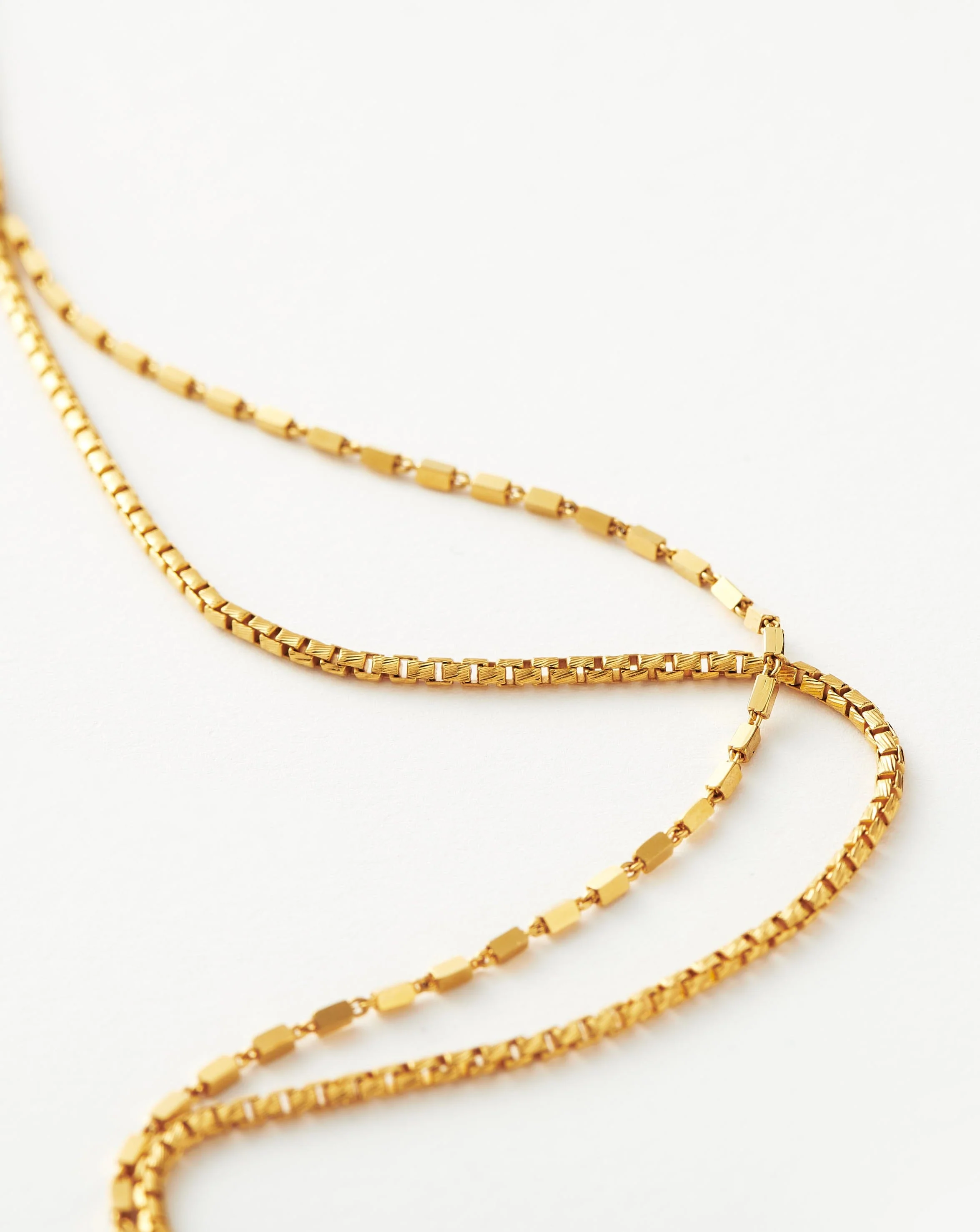 Upgrade your layers with a delicate double chain. Featuring two strands of box-shaped links, this high-shine necklace easily fastens with a claw clasp. Giving the look of two chains in one, pair with a statement necklace to add contrast. ayer for less when bought as a set Molten Twisted Pendant Necklace Set.
