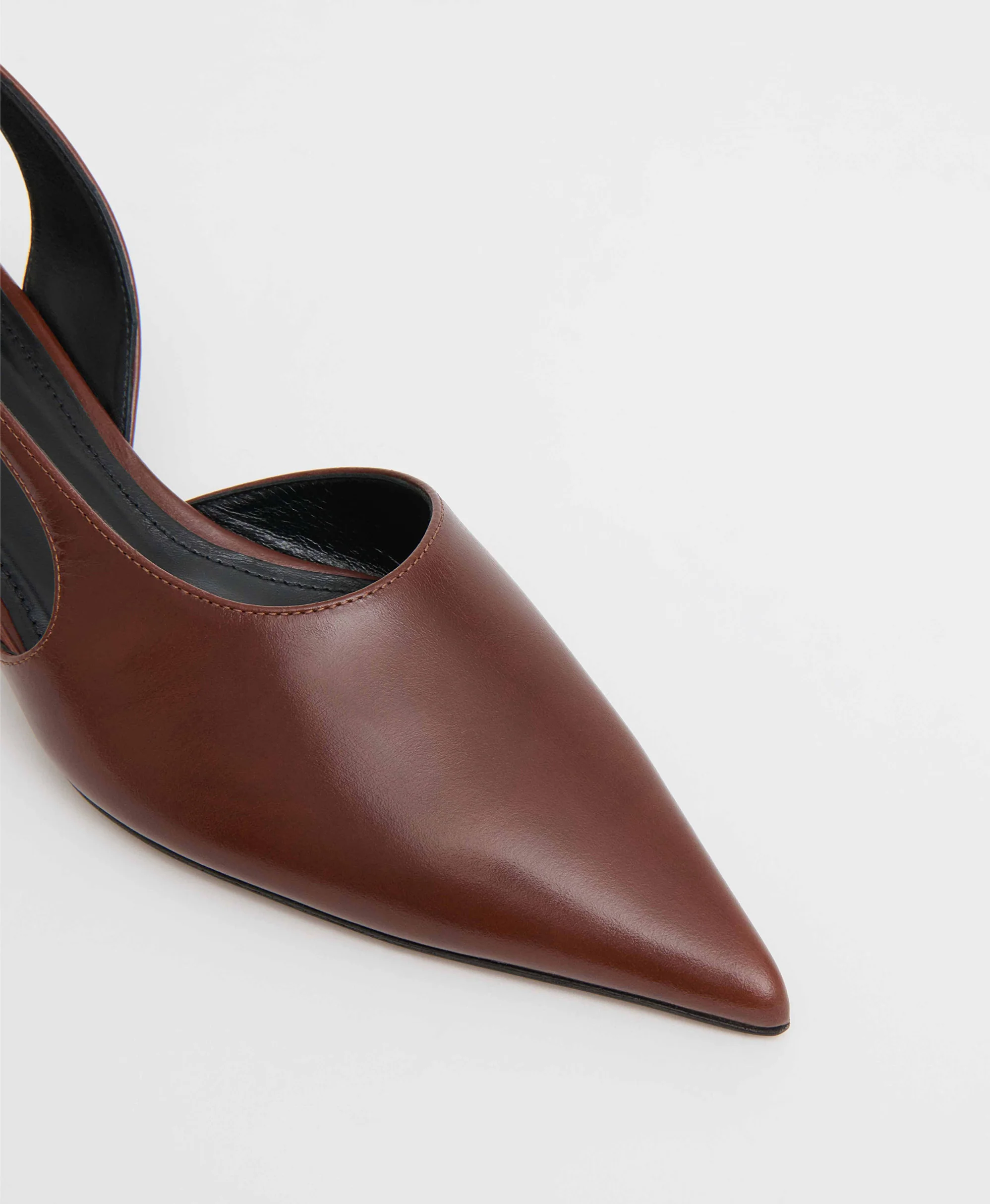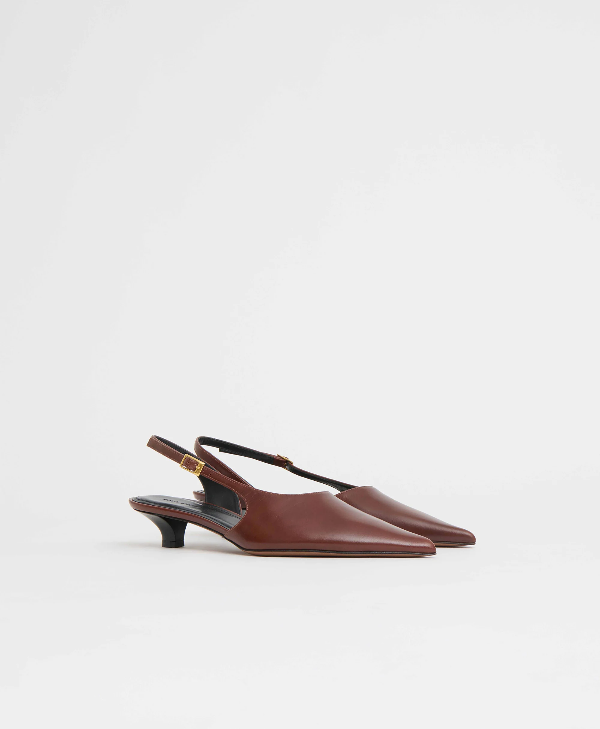 Our Anna Kitten is crafted in Italy from supple lambskin, calfskin leather or rich suede, featuring a pointed toe, a one-inch heel, and an architectural strap that gently cradles the foot for all-day comfort and ease.